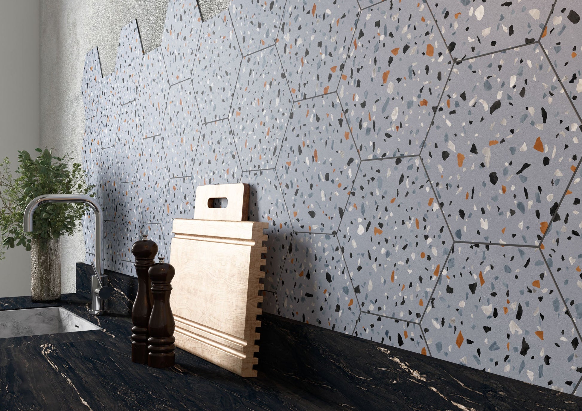 TERRAZZO-LOOK HEXAGONS FOR WALLS AND FLOORS