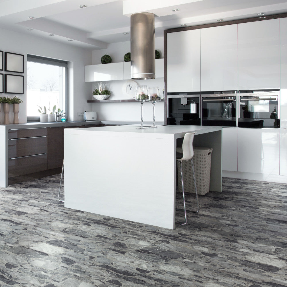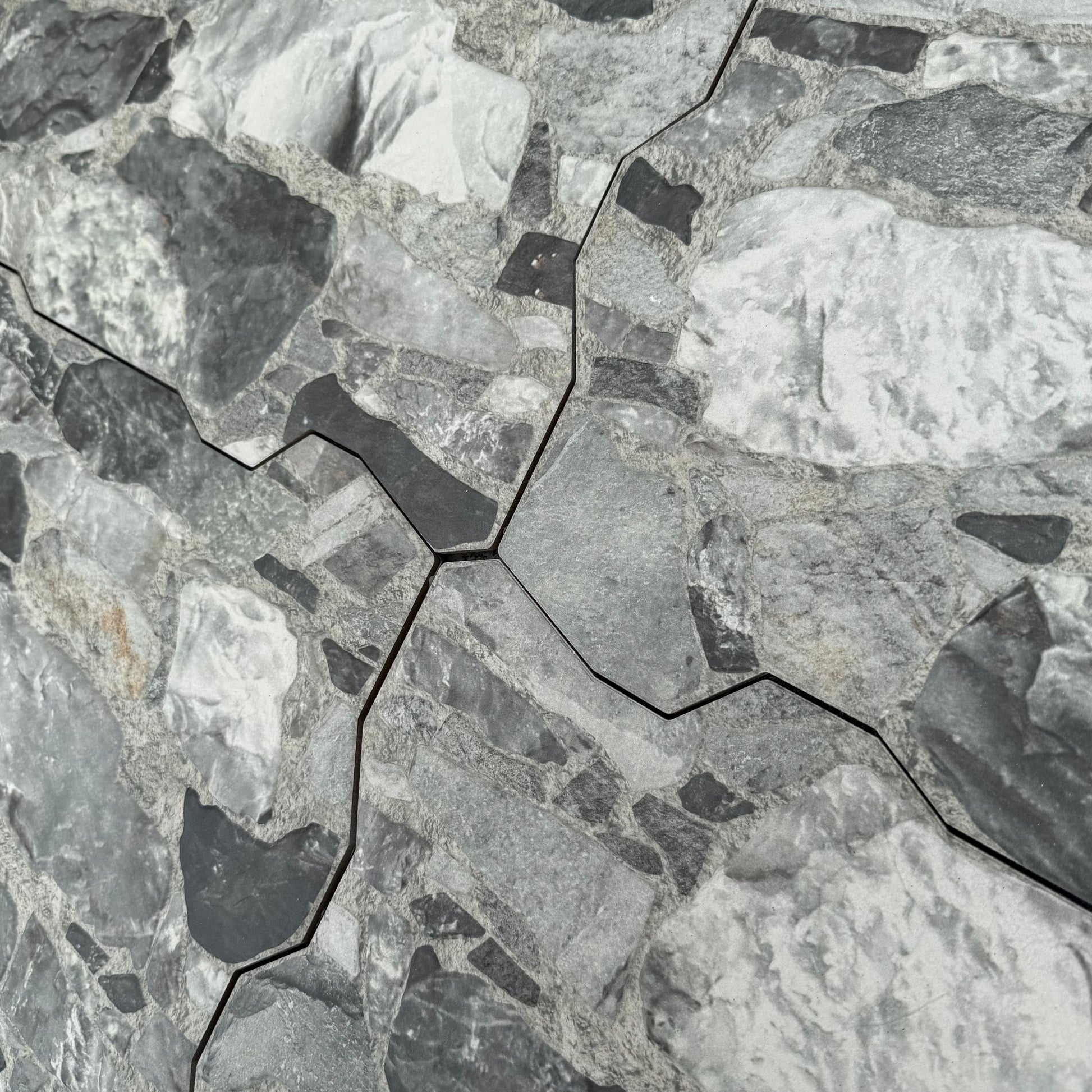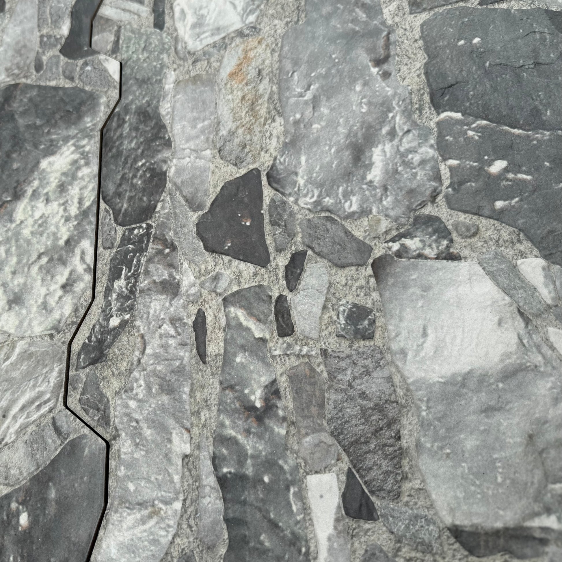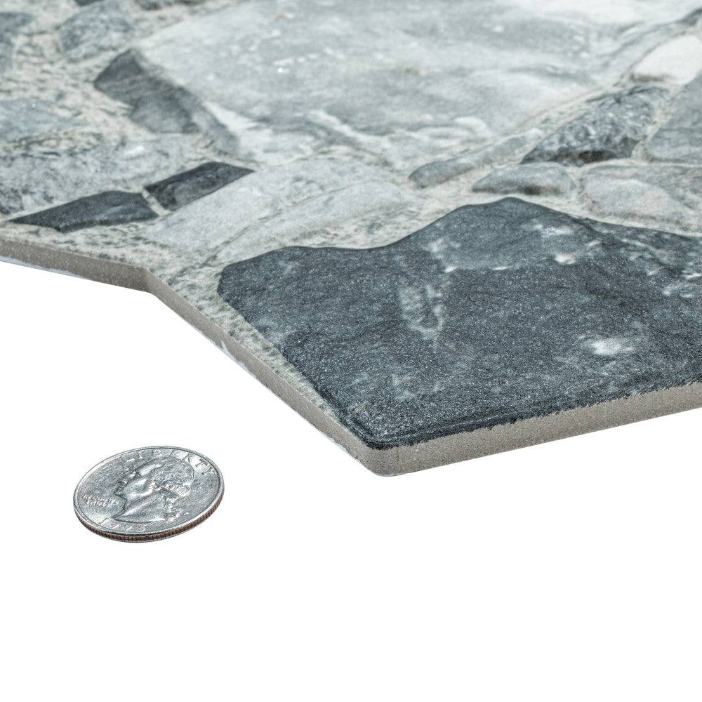 Grafito 14 x 22 gives the impression of a multi-size stone pattern with a slightly textured matte surface. Featuring a mix of stone-like shapes in varying tones of grey, this tile offers a rustic appearance. This product draws heavily from the natural appeal of stone with imitation scuffs and spots that suits a variety of looks, including vintage, natural and modern. Impervious and frost-resistant pocelain make this an ideal choice for both indoor and outdoor installations including kitchens, bathrooms, backsplashes, showers, entryways, and patios.