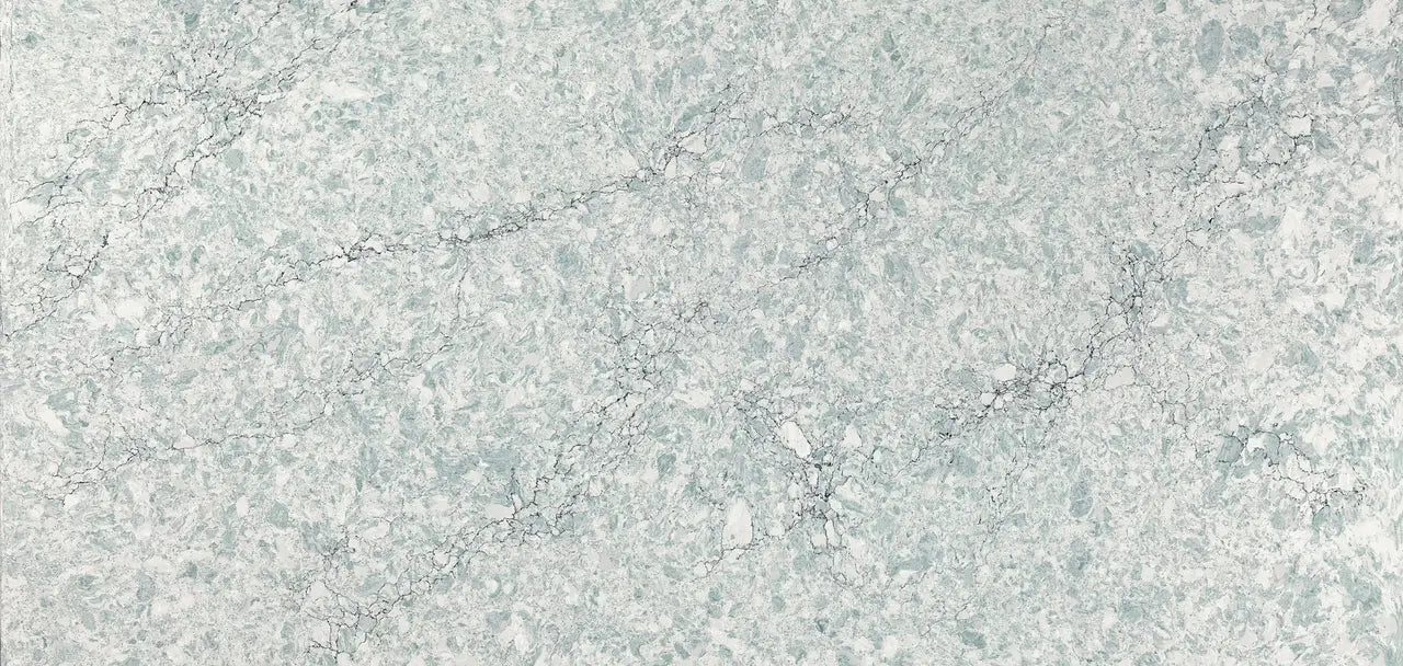 Fine black crackling veins traverse a field of subtle, soft teal and swirling white. Radiant opalescent crystals suggest surprising depth within the greater feeling of smoothness.