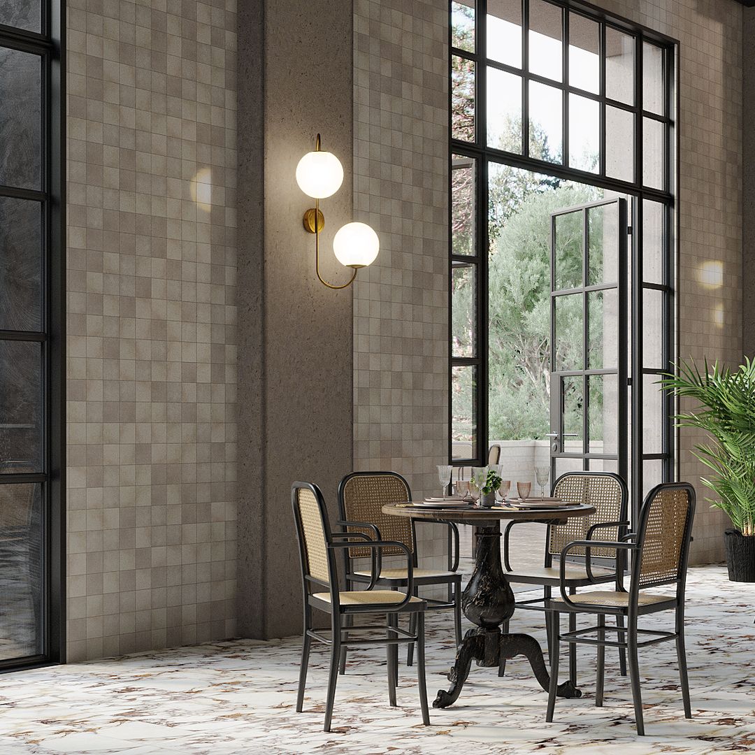 Add a unique and modern flair to your space with the Fairway mosaic. This mosaic features a medley of cream, brown, and blue marbles with mother-of-pearl accent pieces in a unique array of triangles and trapezoids. This mosaic is perfect for creating a sleek and modern space including bathrooms and shower walls.